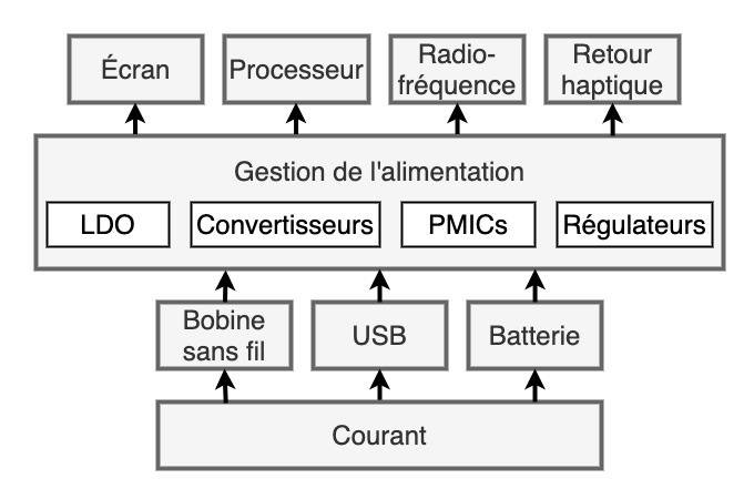 Un smartphone peut faire un tas de choses : appels, textos, prise et visionnage de photos et de vidéos, jeu 3D via Wi-Fi avec une manette Bluetooth. Des sous-circuits (groupes de puces et composants) s’activent pour remplir toutes ces fonctions. Il y a des sous-circuits pour l’écran, le processeur, la connexion sans fil, le retour haptique. Ceux-ci nécessitent différentes quantités d’énergie, en continu ou sur demande. Ils sont donc reliés à des lignes de courant, comme les maisons d’une agglomération.